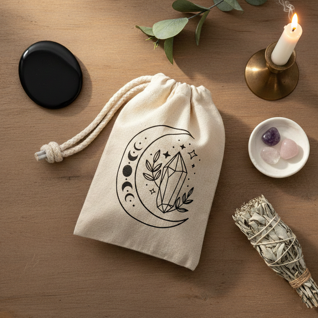 Pochon à cordons en coton recyclé motifs lunes et cristal.