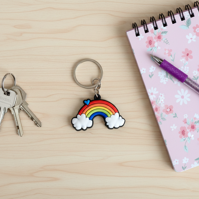 Porte clés arc en ciel, nuages et petit cœur, arrière couleur noir, anneau argenté.