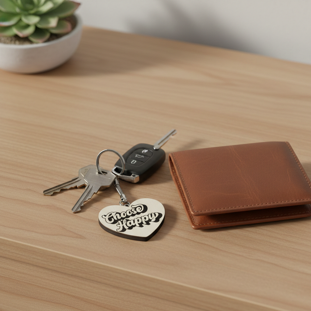 Porte clé cœur en bois avec message positif " Choose Happy ".
