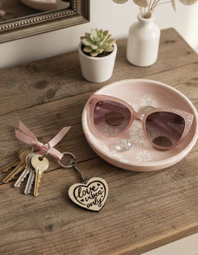 Porte clé cœur en bois avec message positif "Love vibes only"